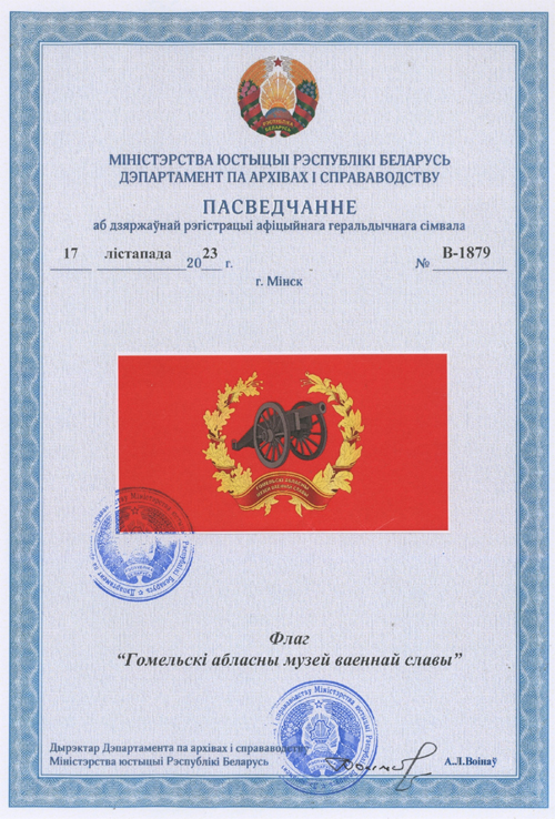 Символы музея зарегистрированы в Государственном геральдическом регистре 17.11.2023 года под № В-1878 (эмблема) и В-1879 (флаг). Источник - сайт Гомельской областной организации Белорусского профсоюза работников культуры, информации, спорта и туризма . |