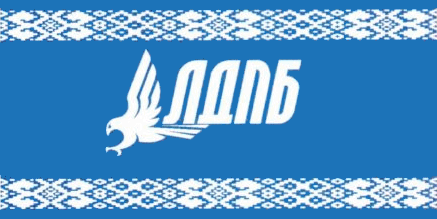 Видимо первый флаг ЛДП РБ: Флаг Либерально-демократической партии представляет собой полотнище прямоугольной формы с соотношением длины и ширины 2:1. Прямоугольник разделен на три части двумя линиями, исходящими из его верхних углов и сходящимися на середине его нижней стороны. Образующиеся при этом треугольники имеют следующие цвета: левый прямоугольный – зеленый, правый прямоугольный – красный, средний равнобедренный – белый. На белом фоне надпись черного цвета на русском языке: «Либерально-демократическая партия». Представленная в изображении флага цветовая гамма, характерна для национального флага Республики Беларусь и указывает на территорию деятельности Либерально-демократической партии. Красный цвет символизирует героическое прошлое нашего народа. Зеленый указывает на характерный для Беларуси природный ландшафт. Белый – символ чести и благородства. По материалам сайта ЛДП Беларуси |