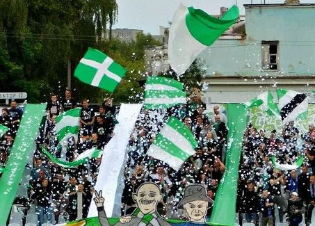 Судя по фотографиям болельщиков, флаг клуба зелено-бело-жёлтый с логотипом. |