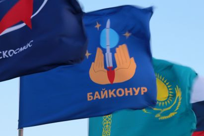 Флаг на космодроме Байконур. Вероятно, флаг космодрома... Этот флаг в Краснодарском государственном историко-археологическом музее-заповеднике назван "флаг космодрома Байконур с гагаринского старта". Источники фото - http://newskaz.ru/politics/20150428/7931222.html