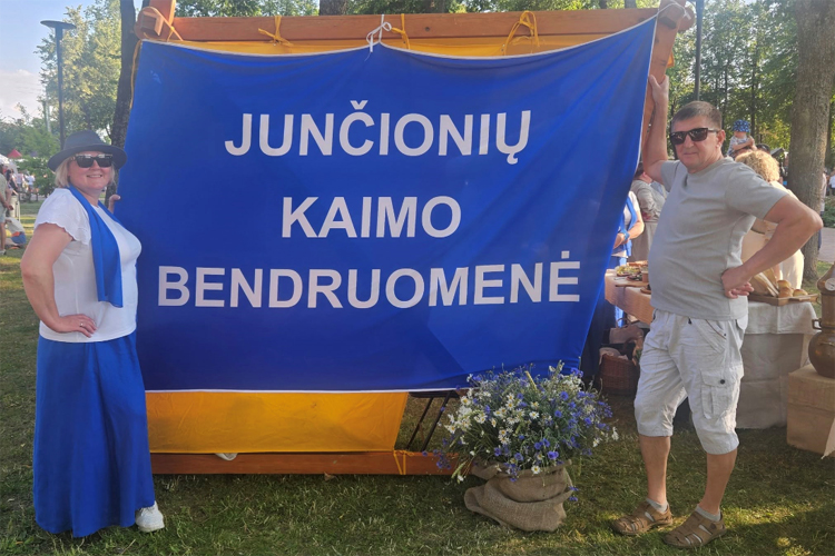 Местная сельская община (Visuomeninė organizacija Junčionių kaimo bendruomenė) использует синий флаг с названием.