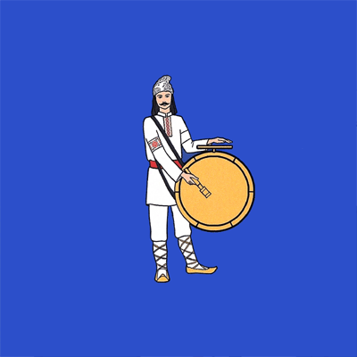 Описание флага села Гёлтосу (Ghioltosu): "Флаг представляет собой квадратное синее полотнище, в середине которого стоящий молодой барабанщик, смотрящий вперед, одетый в национальные одежды, в натуральных цветах, несущий желтый барабан на ремне, перекинутом через правое плечо, и бьющий в него, все влево". |