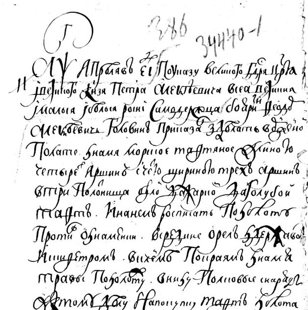 В Росписи, что надобно на галеру "Орел золотой", 22 ноября 1704 года, указано: "на шлюпку флаг шелковый с орлом золотым", "другой флаг что подымается на машту трынкету с орлом золотым", "2 вымпела белых, 2 вымпела лазоревых, 2 флага носовых треугольных белых, 2 флага лазоревых". СМ. "Материалы по истории русского флота", ч. 1, 1865 г.