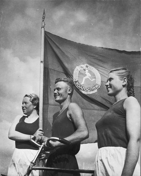 На некоторых фотографиях видно, что на флаге "Колгоспника" изображалась и эмблема ДСО. Слева - фото 1955 г, опубликованное на аукционе "Мешок"; справа фото Е. Халдея нач. 1950-х - проект "История России в фотографиях". Мультимедиа арт музей, Mосква / Московский дом фотографии (МАММ/МДФ) |