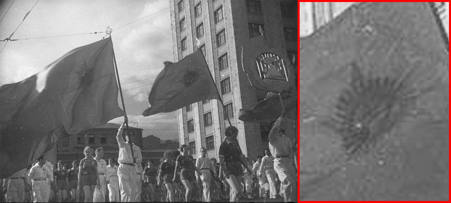 В хронике физкультурного парада 1945 года заметно, что по краям полотнища также идут белые полоски. Это же видно и на плакате ориентировочно конца 40-х годов. Использованы: фото с парада 1945 года и фото плаката, опубликованное в блоге "Эх, прокачу" (zina_korzina) |