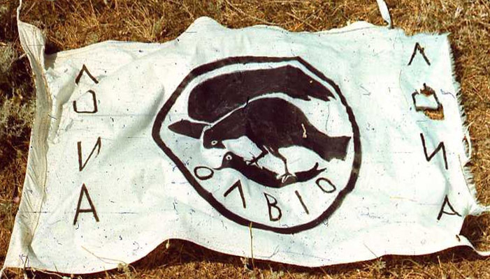 Экспедиционный флаг Ленинградского отделения института археологии АН СССР (во время арх.раскопок в Ольвии, Николаевская область УССР). Фото неизвестного автора 1988 года. В центре флага изображена монета (тетрадрахма) Ольвии, чеканенная в 4 веке до н.э. Фото флага - проект ""История России в фотографиях", архив Г. Пискуновой |
