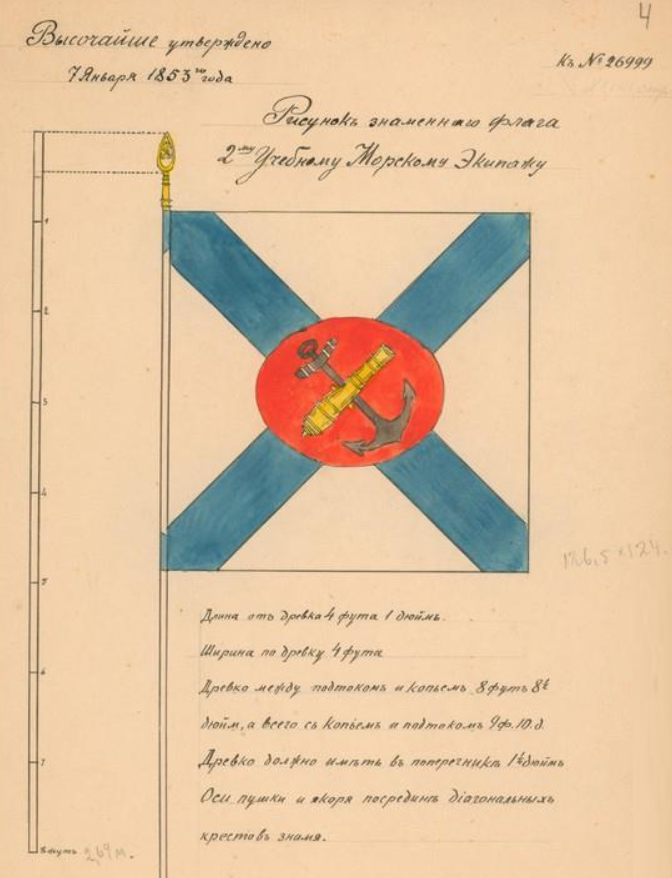 2-й учебный флотский экипаж получил такой же знаменный флаг согласно высочайшему указу от 9 февраля 1853 года [... 7 января 1853 года (ПСЗ №26999)]. Использованы материалы книги В.Соколова "Флаги Российской империи и СССР в документах", 2001. Рисунок флага (акварель) - Государственный мемориальный музей А.В. Суворова (СПб.) |