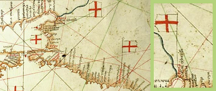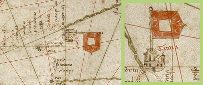 На портолане Черного моря Петро Весконте (1321) приведены несколько флагов: крестовые флаги Константинополя, Фасиса (ныне Поти), Себастополиса, флаг Трапезунда с двуглавым орлом. На территории нынешней России показан флаг колонии Тана (она же Танаис, ныне - Азов), это белое или желтоватое треххвостое полотнище с тамгой, напоминающей по форме литеру "М". Точто такой же флаг показан над крепостью Мауро Кастро (ныне Белгород-Днестровский). Над болгарским городом Варна показан похожий флаг, но тамга более простая. Фрагменты карты - http://papacoma.narod.ru/... (оригинал хранится в ватиканской Апостольской Библиотеке) |