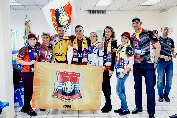 Клуб болельщиков "Кузбасса" "АиБ" (шуточное название, расшифровывающееся "алкаши и быдло") используют флаг в сине-жёлтых клубных цветах, в центре которого изображена карикатурная рожица с пивной кружкой. Источник фотографии "Комсомольская правда" |