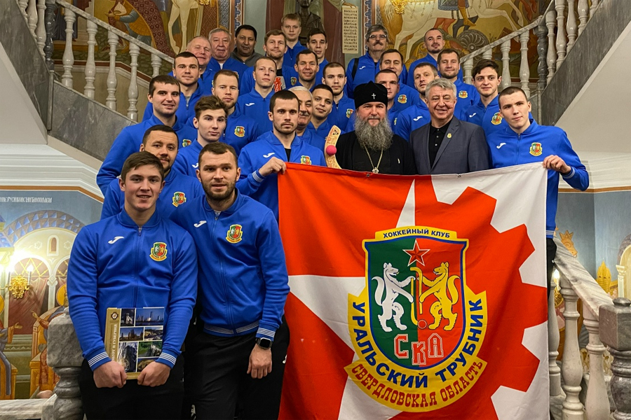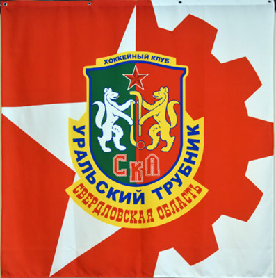 Вариант флага, использовавшийся клубом с 2023 г., в т.ч. на пресс-конференциях и собраниях команды. На полотнище объединены символы бывш. СКА (звезда) и "Уральского трубника" (шестерня). Фото - сайт клуба (встреча с митрополитом Евгением, 2023 г.) |