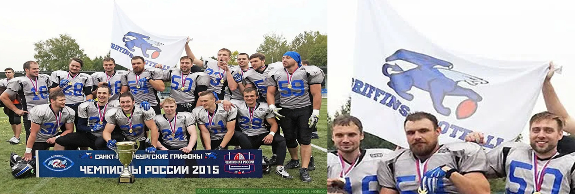 Слева - флаги на фото 2015 года (когда "Грифоны" стали чемпионами России). Справа - синие флаги на фото 2021 года.