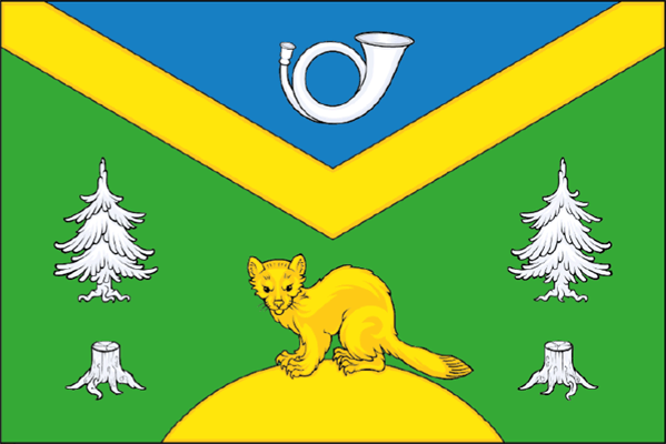 Флаг района "гербовый", то есть повторяет гербовую эмблему района, утвержденную 13 января 1998 года: " В щите ... золотое опрокинутое повышенное стропило. В верхнем голубом поле серебряный почтовый рожок. В нижнем зеленом поле золотая куница на золотом холме, сопровождаемая по сторонам попарно серебряными елью и пнем". Голубой цвет поля символизирует былую чистоту воздуха, поступающего в Москву из Подмосковья и давшего Кунцеву в конце XIX века славу дачного места. Серебряный почтовый рожок напоминает о проходившем по территории района почтовом тракте (нынешняя улица Ивана Франко). Золотое стропило помещено в память о строительстве железнодорожного пути Смоленской железной дороги. Зеленое поле и серебряные ели напоминает о густых непроходимых лесах Сетуньского стана, в состав которого входила территория нынешнего района. Серебряные пни показывают судьбу этих лесов, вырубленных для строительства железной и сухопутной дорог, а также для получения древесного угля. Золотая куница символизирует название района. Изображение флага и другие материалы любезно предоставлены И.Карташовым (г.Москва) Флаг муниципального образования Кунцево был утверждён (подтверждён) Решением Муниципального собрания МО Кунцево от 10 февраля 2004 года №55-8.МС/4. "Флаг муниципального образования Кунцево представляет собой двустороннее, прямоугольное полотнище с соотношением сторон 2:3.В зелёном полотнище флага голубой опрокинутый равнобедренный треугольник, основание которого совпадает с верхним краем полотнища, а вершина на 3/40 ширины полотнища смещена от центра полотнища к его верхнему краю.В голубом треугольнике помещено изображение белого почтового рожка, габаритные размеры которого составляют 5/24 длины и 3/16 ширины полотнища флага. Центр изображения равноудалён от боковых краёв полотнища и находится на расстоянии 3/16 ширины полотнища от его верхнего края.К голубому треугольнику примыкает жёлтое опрокинутое стропило, вершин которого на 3/40 ширины полотнища смещена от центра полотнища к его нижнему краю.В боковых частях полотнища помещены изображения серебристой ели и серебряного пня под ней, между ними, примыкающее к нижней части полотнища изображение жёлтого холма с жёлтой, обращённой к древку куницей на нём.Габаритные размеры изображения холма и куницы составляют 5/12 длины и 5/16 ширины полотнища.Габаритные размеры изображения серебряных ели и пня составляют 1/6 длины и 1/2 ширины полотнища флага. Центр каждого изображения находится на расстоянии 1/6 длины полотнища от ближайшего бокового края полотнища, и на расстоянии 5/16 ширины полотнища от его нижнего края". Материалы геральдического архива В.Маркова |
