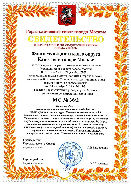 Флаг внесен в Государственный геральдический регистр РФ под № 12767 и в Геральдический реестр города Москвы МС № 36/2. Фото свидетельств с официального сайта муниципального округа Капотня |