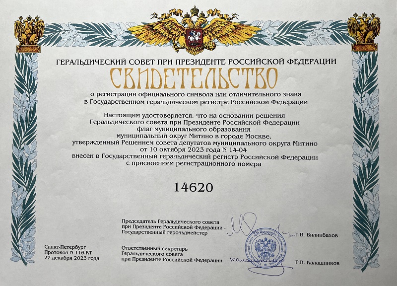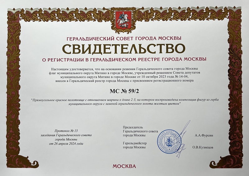 Флаг внесен в Государственный геральдический регистр РФ под № 14620, а также в геральдический реестр города Москвы под регистрационным номером МC № 59/2. Фото свидетельств - сайт "МИТИНО.РФ" |