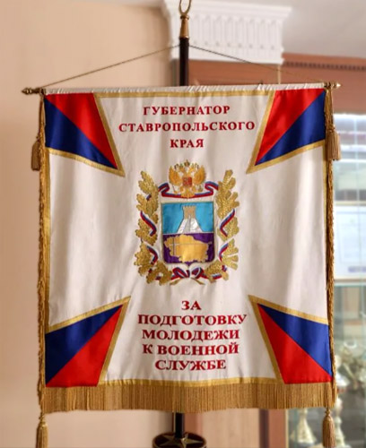 На лицевой стороне полотнища над гербом Ставропольского края - надпись прописными буквами: "Губернатор Ставропольского края", под гербом Ставропольского края - надпись строчными буквами: "За подготовку молодежи к военной службе".