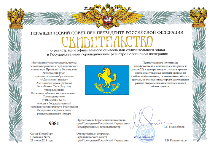 депутатов от 4 февраля 2014 года № 63. Флаг внесён в Государственный геральдический регистр РФ под № 9381.