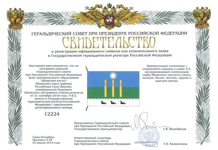 Флаг Абыйского наслега утвержден Решением наслежного Совета депутатов от 21 сентября 2018 года № 8/2.