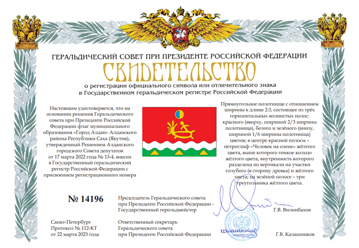 Фактически флаг повторяет композицию герба города, разработанного в 1984 году. Авторская группа: идея герба - А.И. Пашков, Ю.И. Пашков (оба г. Алдан); художник - А.М. Кужевский (г. Алдан / г. Находка); геральдическая доработка, компьютерный дизайн, обоснование символики - Ю.Ю. Росич (г. Москва). Материалы сайта Геральдика.РУ На сайте правительства Якутии описание флага несколько другое: "Прямоугольное полотнище с отношением ширины к длине 2:3, состоящее из трех горизонтальных волнистых полос: красного (вверху, шириной 2/3 ширины полотнища), белого и зеленого (внизу, шириной 1/6 ширины полотнища) цветов; в центре красной полосы – петроглиф «Человек на олене» желтого цвета, выше которого тонкое кольцо желтого цвета, внутренность которого разделена по вертикали на участки голубого (в сторону древка) и желтого цвета; на зеленой полосе – три треугольника желтого цвета". См. https://www.sakha.gov.ru/aldan |