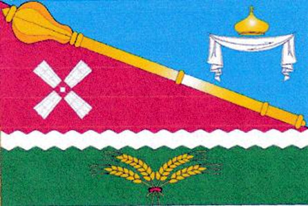 "В лазоревом и червленом поле, разделенном золотым перначом в правую перевязь, с зеленой оконечностью, обремененной четырьмя золотыми колосьями, перевязанными червленой лентой и окаймленной широким серебряным волнистым поясом. Пернач сопровожден в лазури серебряным платом (покровом) и в червлени — серебряным мельничным ветряком".