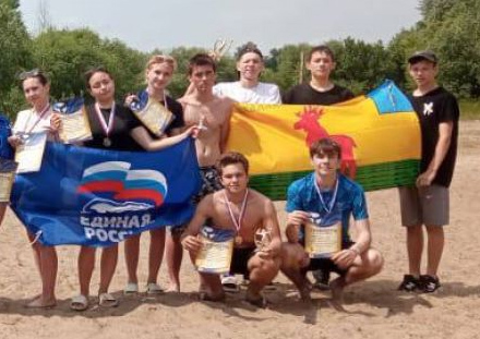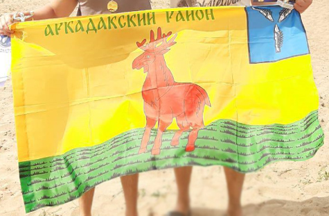 Неофициальный флаг Аркадакского района - на полотнище воспроизведен сюжет герба района. Первое фото прислано В. Попоски, второе - турнир по пляжному волейболу в с. Красный Яр, 2025 г. |
