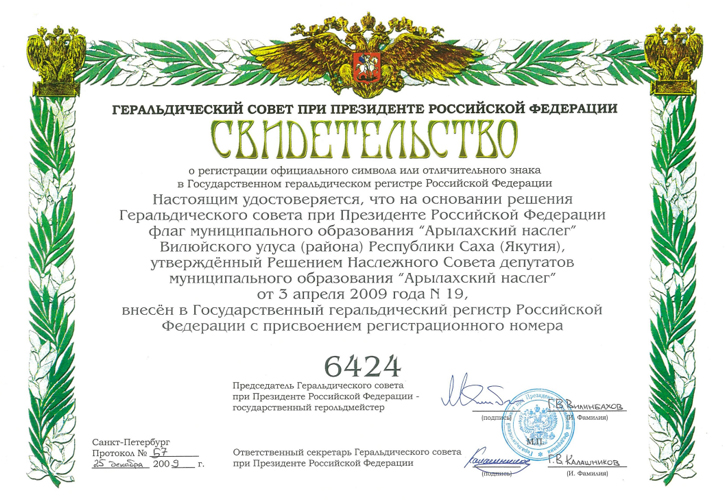 По материалам геральдического архива В.Маркова. Фото свидетельства с сайта Правительства РС(Я) - https://www.sakha.gov.ru