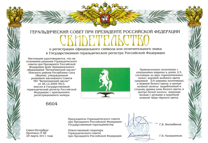 Вероятно по рекомендации Геральдического совета серебряная кайма была удалена из флага. Флаг утвержден Решением наслежного Совета МО "Беченчинский наслег" от 28 декабря 2009 года №9/2. В итоге флаг вошел в Государственный геральдический регистр под № 6604 со следующим описанием: "Прямоугольное полотнище с сотношением ширины к длине 2:3, состоящее из двух горизонтальных полос: верхней зелёного цвета (шириной 3/4 ширины полотнища), и нижней белого цвета; в центре зеленой полосы вздыбленный в сторону древка конь белого цвета; в центре белой полосы широкая мелкая с ручками и короткой ножкой чаша чёрного цвета". По материалам геральдического архива В.Маркова со ссылкой на информацию из Геральдического Совета при президенте РФ. Фото свидетельства с сайта Правительства РС(Я) - https://www.sakha.gov.ru |
