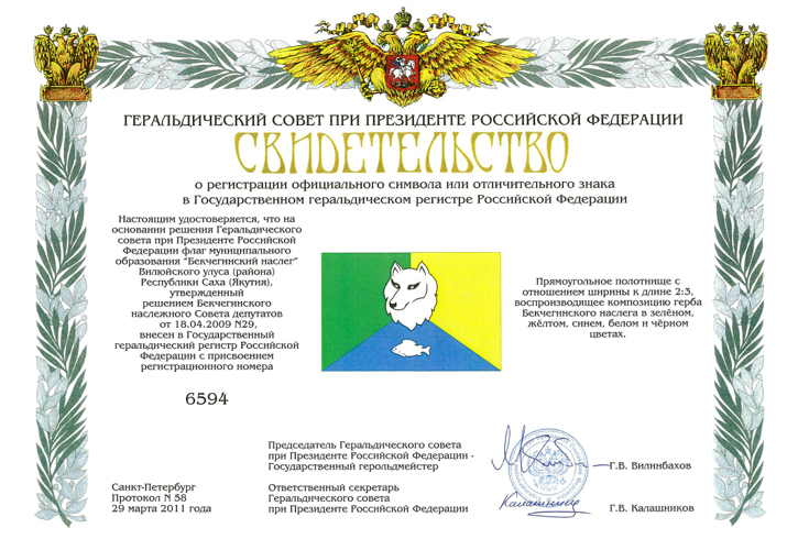 Решением Бекчегинского наслежного Совета депутатов № 29 от 18 апреля 2009 года (несколько исправлялся экспертами Герсовета).