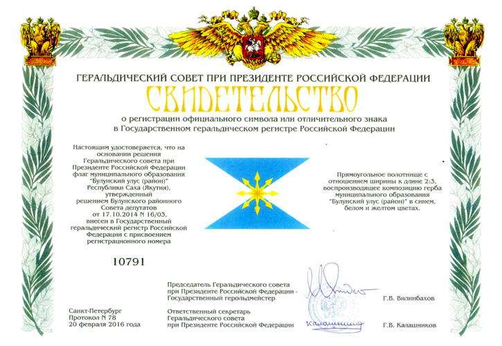 Флаг Булунского улуса утверждён Решением Булунского районного совета депутатов от 17 октября 2014 года № 16/03 "Об утверждении Положения о флаге муниципального образования "Булунский улус (район)". . Описание флага муниципального района: "Прямоугольное полотнище соотношением ширины к длине 2:3, воспроизводящее композицию герба муниципального образования «Булунский улус (район)» в голубом, желтом, оранжевом и белом цветах". В 2016 году флаг улуса внесен в Государственный геральдический регистр РФ под № 10791. Текст документа - по сообщению В. Пермякова. Рисунок предоставлен В. Марковым |
