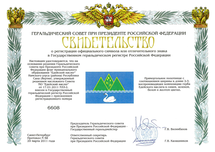 По материалам геральдического архива В.Маркова. Фото свидетельства - с сайта Правительства РС(Я).