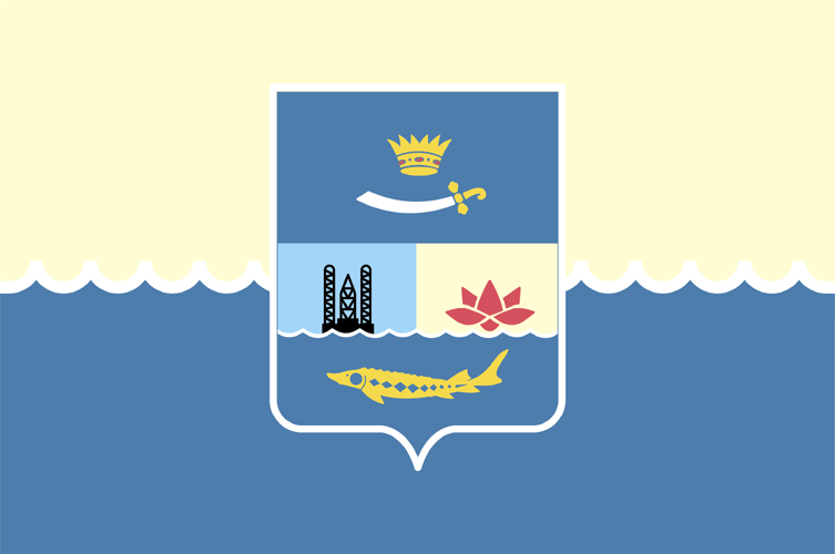 - Нижняя половина эмблемного щита отражает символику муниципального образования "Икрянинский район". Деление этой части щита - пересечение с полурассечением верхней части. Пересечение оформлено в виде одного ряда полуциркулярных серебряных волн, зубцами вверх. В нижней части в лазоревом поле изображение золотого икряного осетра головой вправо, отображающего основополагающую роль в экономике, истории, названии района рыбной отрасли. В верхней правой части на серебряном поле изображение силуэта морской плавучей буровой установки в транспортном положении - символ промышленности района. В верхней левой части в зелёном поле распустившийся 5-ти лепестковый цветок лотоса красного цвета - символ уникальности волжского понизовья.