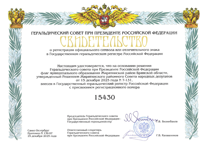 Официальные символы Жирятинского муниципального района утверждены Решением Жирятинского районного Совета народных депутатов от 15.12.2025 года № 7-131. Флаг внесен в Государственный геральдический регистр РФ под № 15430. 9.1. Описание флага Жирятинского района: