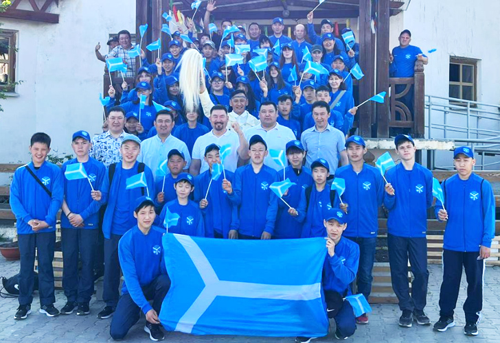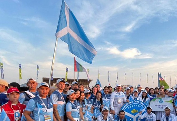 На проактике флаг улуса выполняется по "чешской модели", т.е. треугольник располагается у древка. Фото 2023 г. - спортсмены Кобяйского района на спартакиаде "Спортивные якутяне"