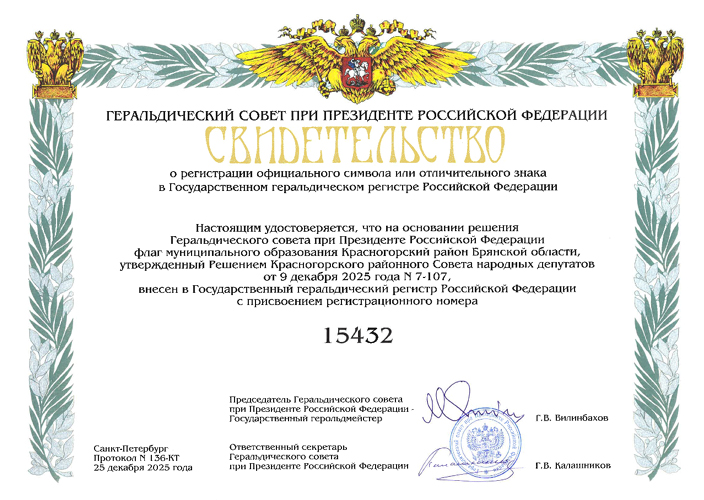 Официальные символы Красногорского района утверждены Решением Красногорского районного Совета народных депутатов от 9 декабря 2025 г. № 7-107. Флаг внесён в Государственный геральдический регистр РФ под № 15432. "9.1. Описание флага Красногорского района: