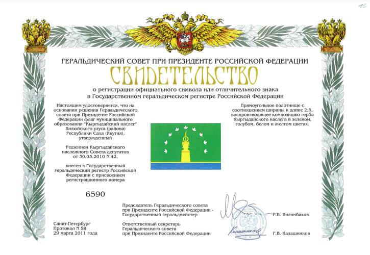 По материалам геральдического архива В.Маркова. Фото свидетельства с сайта Правительства РС(Я) - https://www.sakha.gov.ru