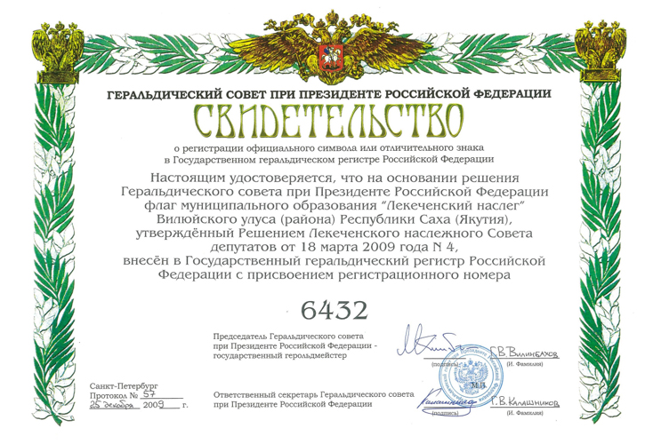 Флаг внесен в Государственный геральдический регистр РФ под № 6432.