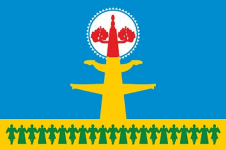 "Прямоугольное полотнище с отношением ширины к длине 2:3, воспроизводящее композицию герба Мар-Кюельского наслега в синем, желтом, зеленом, белом и красном цветах".