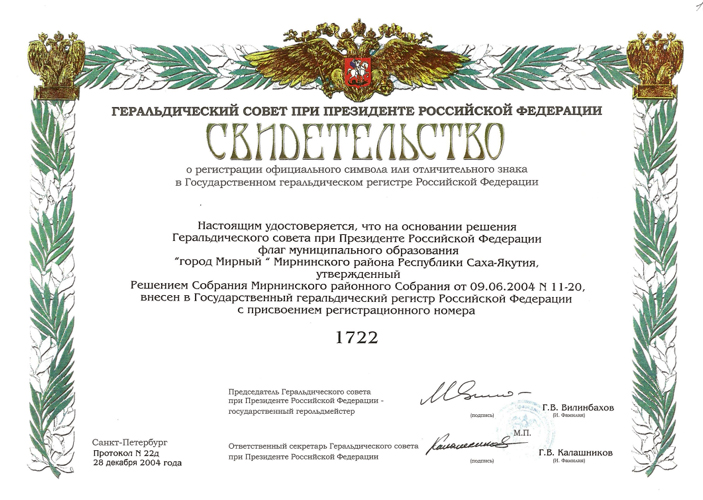 Флаг внесен в Государственный геральдический регистр под № 1722 в декабре 2004 года (как флаг города Мирного).