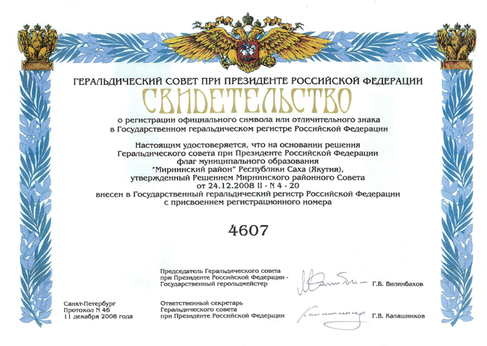 (решение Президиума районного Совета от 01.02.2007г. №1-9 "О гербе и флаге МО "Мирнинский район" РС(Я)).