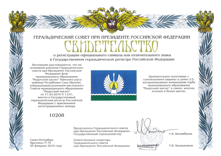 Флаг внесен в Государственный геральдический регистр РФ под № 10208 cо ссылкой на тот же акт. При этом рисунок его несколько упрощён. Описание в свидетельстве ГГР: "Прямоугольное полотнище с соотношением ширины к длине 2:3, воспроизводящее композицию герба МО "Модутский наслег" в синем, жёлтом, зеленом и белом цветах". Материалы геральдического архива В. Маркова. Фото свидетельства - с сайта Правительства РС(Я) = https://www.sakha.gov.ru |