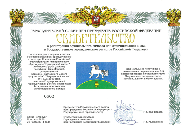 Флаг Мукучунского наслега утверждён Решением наслежного Совета депутатов № 3В от 11 мая 2009 года. Автор флага: Матвеев Артур Матвеевич (г. Якутск). "Прямоугольное полотнище с соотношением ширины к длине 2:3, воспроизводящее композицию герба Мукучунского наслега в синем, зеленом, желтом и белом цветах". Флаг внесен в Государственный геральдический регистр РФ под № 6602. По материалам геральдического архива В.Маркова. Фото свидетельства - официальный информационный портал Республики Саха |