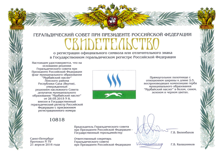 По материалам геральдического архива В.Маркова. Фото свидетельства с сайта Правительства РС(Я) - https://www.sakha.gov.ru
