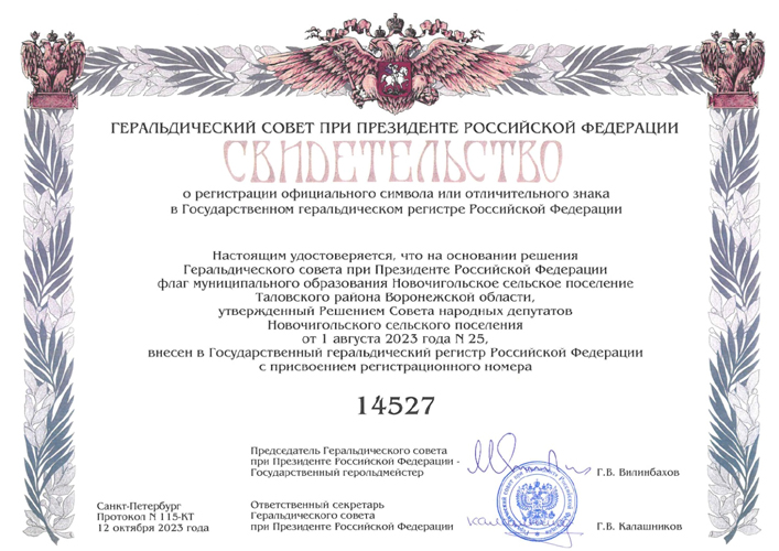 от 01.08.2023 года № 25 "Об официальных символах (гербе и флаге) Новочигольского сельского поселения Таловского муниципального района Воронежской области".