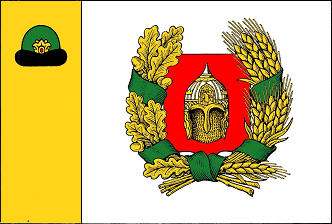 Флаг Новодеревенского района утвержден Решением Новодеревенской районной Думы Рязанской области от 31 июля 2006 года №135. Официальное описание флага: "Прямоугольное полотнище, разделенное в отношении 1:4 вертикальной полосой желтого цвета. Полоса примыкает к древку. Отношение ширины флага к его длине равно 2:3. В центре белого полотна изображен герб: в серебряном поле червленый щиток, обременённый серебряным шлемом святого благоверного князя Александра Невского, имеющем золотую отделку и такую же кольчужную подкладку; щиток обрамлен венком, состоящим справа из золотых дубовых ветвей, а слева - из золотых хлебных колосьев; венок перевит зеленой лентой. Высота изображение составляет примерно 4/5 ширины полотнища. На желтой вертикальной полосе, в верхней трети полосы помещена старинная зеленая княжеская шапка, венчающая голову князя в областном гербе. Шапка оторочена черным собольим мехом, над которым укреплено золотое украшение (городок) с красным самоцветным камнем". Решением Новодеревенской районной Думы Рязанской области от 23 июня 2010 г. №226 "О внесении изменений в Положение о флаге муниципального образования - Новодеревенский муниципальный район, утвержденное решением Новодеревенской районной Думы от 31 июля 2006 года N 135 "О флаге муниципального образования - Новодеревенский муниципальный район" по рекомендации Государственного герольдмейстера Вилинбахова Г.В. был изменен текст Положения о флаге района. Новая редакция описания флага: "Флаг Новодеревенского муниципального района представляет собой прямоугольное полотнище с отношением ширины к длине 2:3, состоящее из двух вертикальных полос: желтого (у древка, шириной 1/4 длины полотнища) и белого цвета: вверху желтой полосы - старинная зеленая княжеская шапка с черной опушкой и желтым украшением (городком) с красным самоцветом: в центре белой полосы - фигуры из герба района: белый с желтыми деталями шлем святого благоверного князя Александра Невского на красном щитке, окруженном желтым венком из дубовых листьев (со стороны древка) и хлебных колосьев, перевитых зеленой лентой". Материалы справочной правовой системы "Гарант" Флаг внесен в Государственный геральдический регистр РФ под № 2715. |