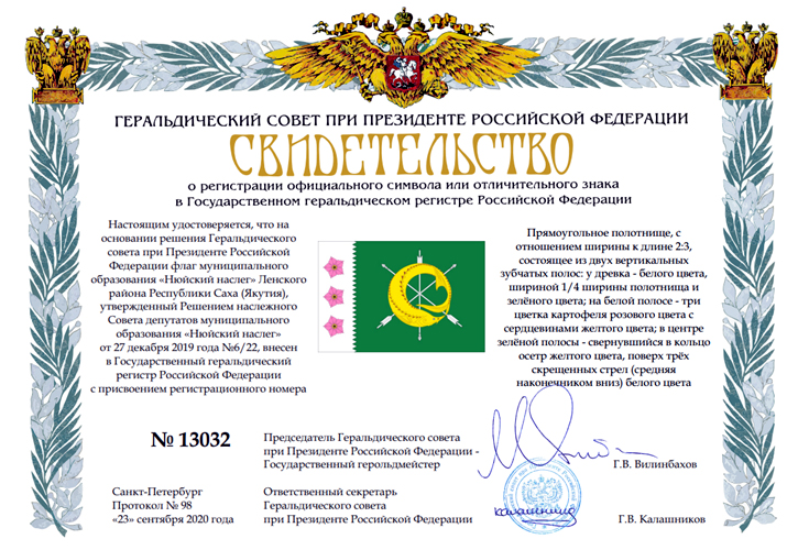 Герб и флаг Нюйского наслега утверждены решением наслежного Совета депутатов от 27.12.2019 года № 6/22.