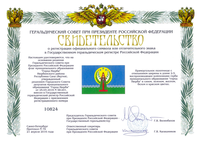 Новый флаг муниципального образования «Город Нюрба» Нюрбинского района Республики Саха (Якутия) утверждён Решением городского Совета депутатов МО "город Нюрба" № 42-201 от 25 марта 2016 года. На полотнище флага изображена "...женщина в национальном якутском одеянии (червленом нижнем одеянии, зеленом с серебряными украшениями верхнем одеянии: с серебряным ожерельем с бляхой и длинными подвесками на груди: в червленом головном уборе с круглым серебряным налобником; с берестяными рукавами) стоящая прямо с воздетыми руками, причем рукава ее одеяния прорастают многочисленными березовыми листьями, а над головой между руками поверх безанта – три лазоревых алмаза". Описание флага: "Прямоугольное полотнище с отношением ширины к длине 2:3, воспроизводящее композицию герба муниципального образования «город Нюрба» в синем, зелёном, жёлтом, белом и красном цветах". Флаг внесён в Государственный геральдический регистр РФ под № 10824. По сообщению В. Пермякова со ссылкой на http://old.sakha.gov.ru/node/302684. Данные об утверждении - от В. Маркова. |