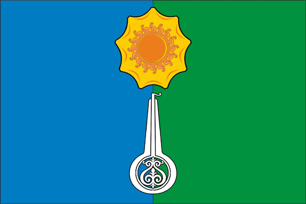На флаге изображены: бубен – символ происхождение рода, солнце – символ жизни, хомус (музыкальный инструмент) – процветание, пояс – символ реки Лены.