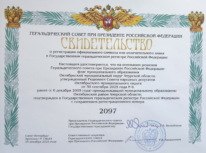 После преобразования муниципального района в Октябрьский муниципальный округ (2025) его символы были переутверждены Решением Совета народных депутатов Октябрьского муниципального округа от 30 сентября 2025 года № 8. Выдано и повторное свидетельство Геральдического совета о регистрации флага в Государственном геральдическом регистре РФ (с тем же номером 2097). По информации И. Афонасенко |