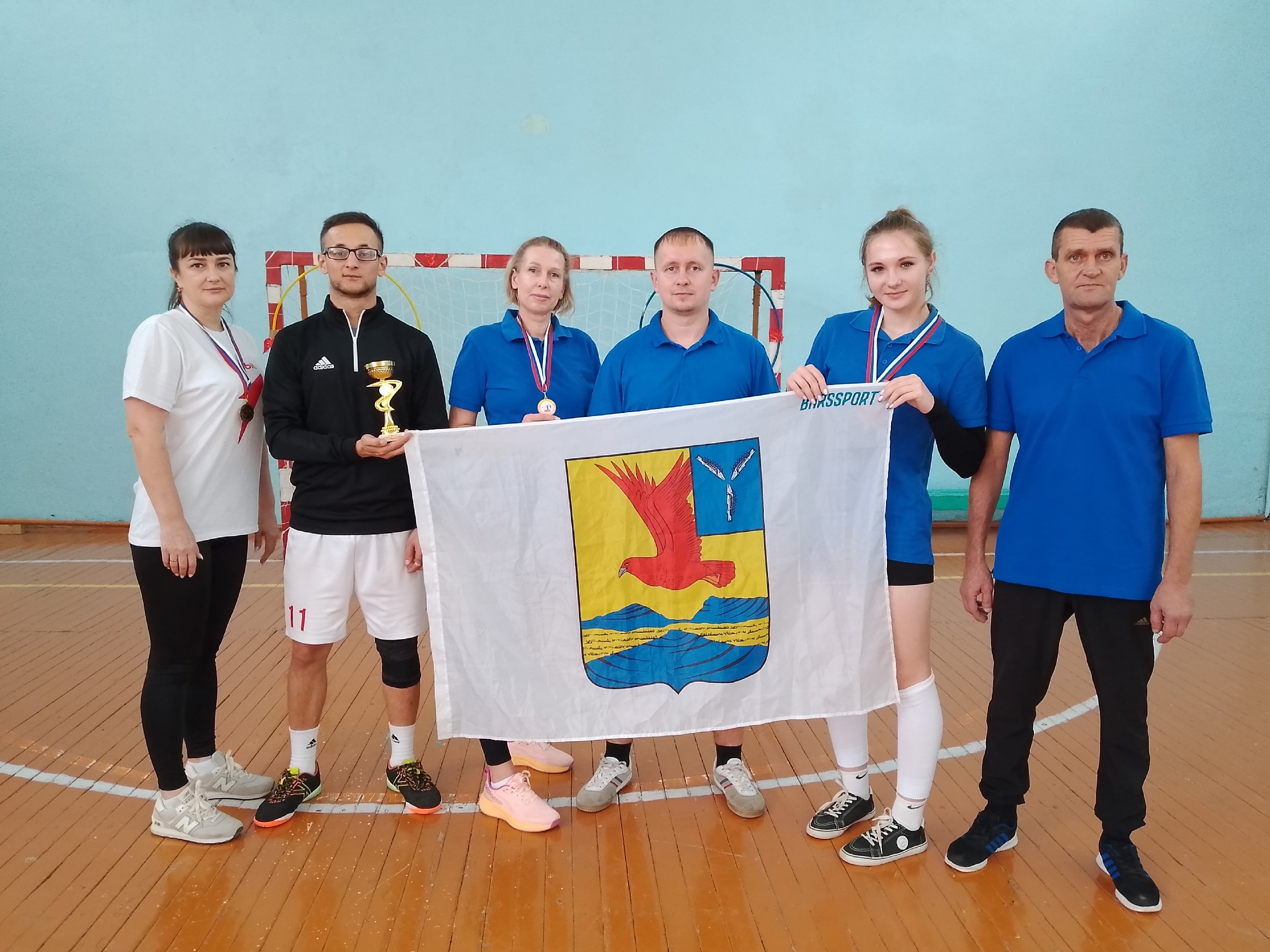Прямоугольное полотнище с соотношением ширины к длине 2:3, состоящее из двух горизонтальных полос: верхней желтого цвета и нижней – синего цвета, в соотношении ширины полос 2:1, с двухсторонним изображением в центре желтой полосы красного степного орла, обращенного вправо и летящего к древку. Габаритная ширина изображения орла 1/3 от длины полотнища.