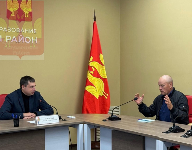 В районе, а затем муниципальном округе фактически используется флаг на основе герба МО "Петушинский район", утвержденного Решением Совета народных депутатов Петушинского района № 138/14 от 31 октября 2002 г. На красном полотнище изображены два сообращенных желтых поющих петуха. Фото из администрации Петушинского района прислано В. Попоски, 2025 г. |