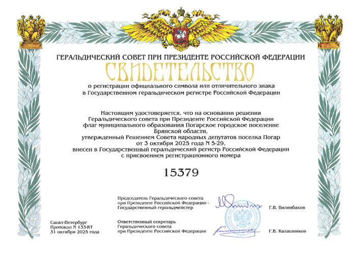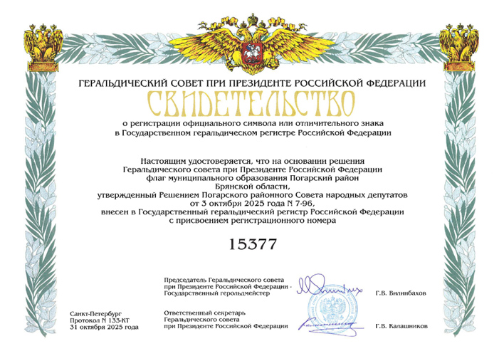 Флаг Погарского района внесён в Государственный геральдический регистр РФ под № 15377. По информации И. Афонасенко |